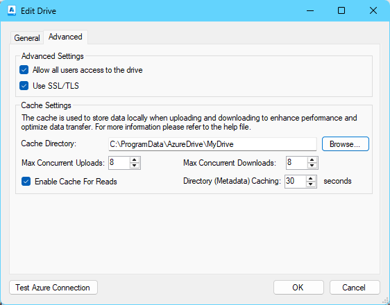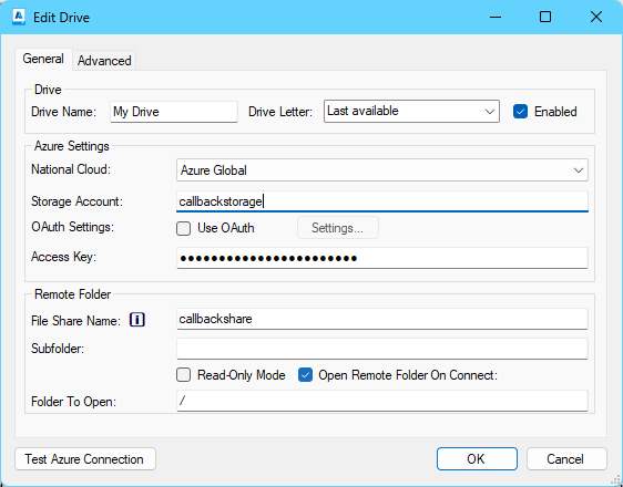 - The Test Azure Connection button will verify the connection to the Azure Storage service can be successfully established. When configuration is complete press OK to complete the drive configuration.