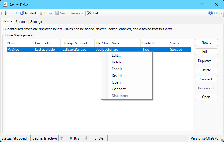 The Start and Stop buttons provide the basic functionality of Azure Drive. Enabled drives are mounted when Start is pressed and all drives are unmounted when Stop is pressed. Start and Stop buttons can also be found in the system tray. The Restart button unmounts and subsequently mounts the currently running drives.
