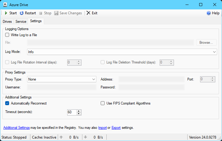 Please be aware that configuration changes will not take effect until you click the Save Changes button in the Azure Drive toolbar, which will save the settings to the Windows registry.