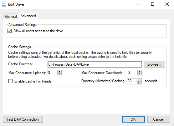 | UseMetadataCache | DWORD | Specifies whether DAV Drive will use caching for file metadata and directory enumeration entries. Disabling will cause DAV Drive to re-download this information when it is requested by Windows and will slow performance.