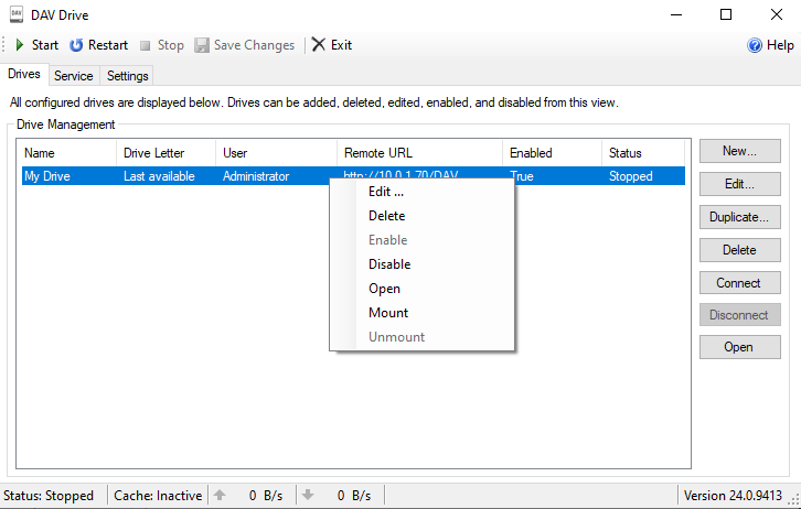 The Start and Stop buttons provide the basic functionality of DAV Drive. Enabled drives are mounted when Start is pressed and all drives are unmounted when Stop is pressed. Start and Stop buttons can also be found in the system tray. The Restart button unmounts and subsequently mounts the currently running drives.