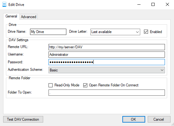- The Test DAV Connection button will verify the connection to the DAV server can be successfully established. When configuration is complete press OK to complete the drive configuration.
