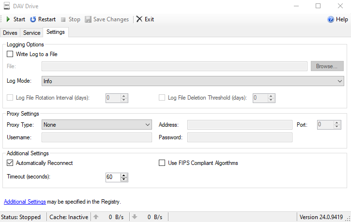 Please be aware that configuration changes will not take effect until you click the Save Changes button in the DAV Drive toolbar, which will save the settings to the Windows registry.